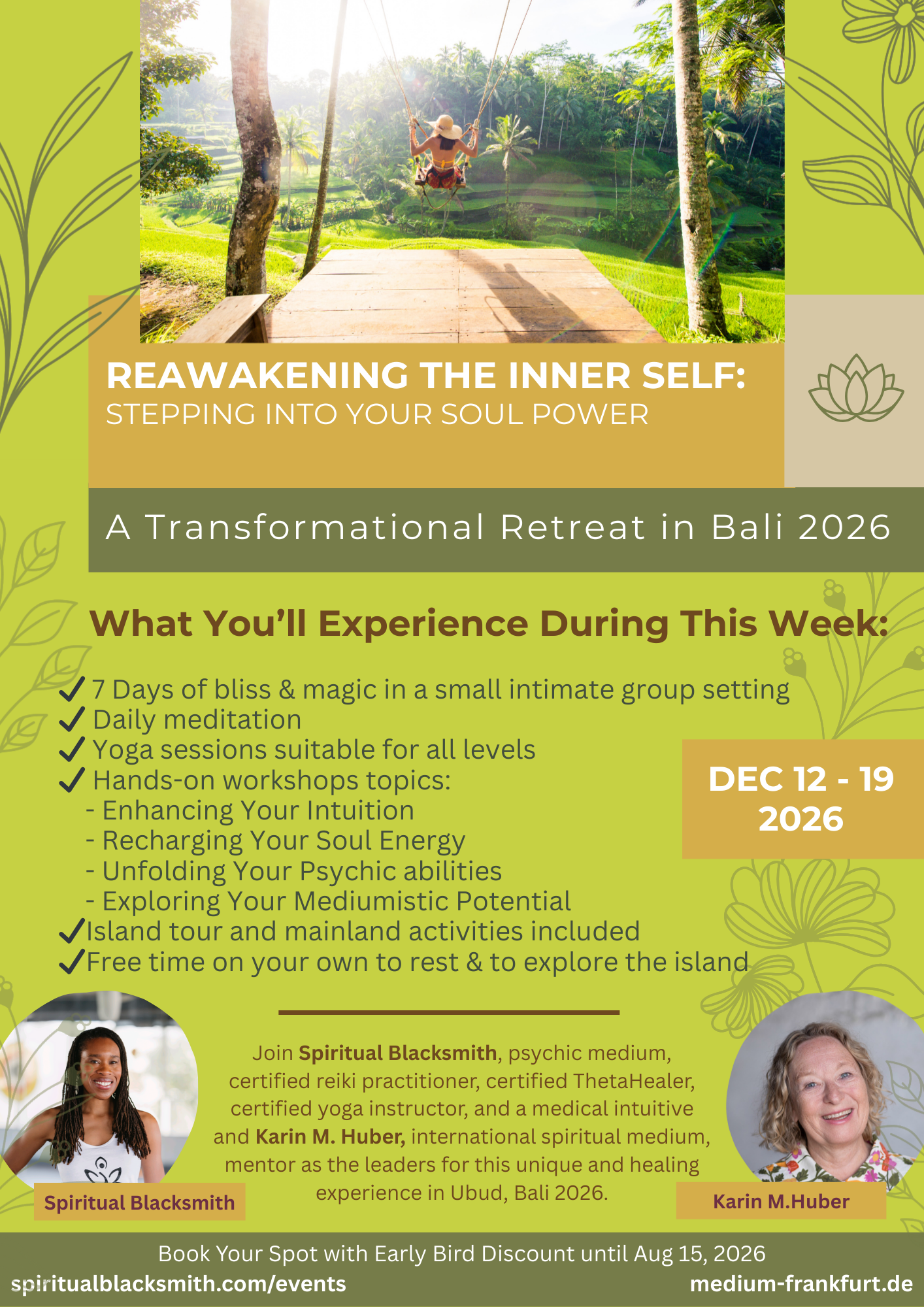 Together, we’ll engage in spiritual practices that will cultivate trust in your inner self, your intuition and expand your spiritual awareness and faculties. This is truly a journey of soul empowerment, manifesting joy, strength, self-love, and purpose into your life, nestled in the beautiful surroundings of Bali’s lush nature.